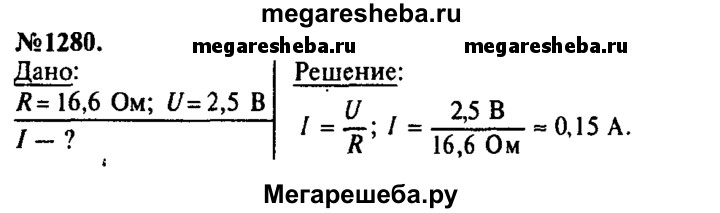 1280. Чему равна сила тока в электрической лампе карманного фонаря, если сопротивление нити накала 16,6 Ом и лампа подключена к батарейке напряжением 2,5В?