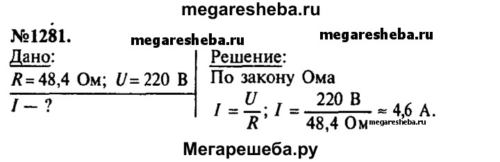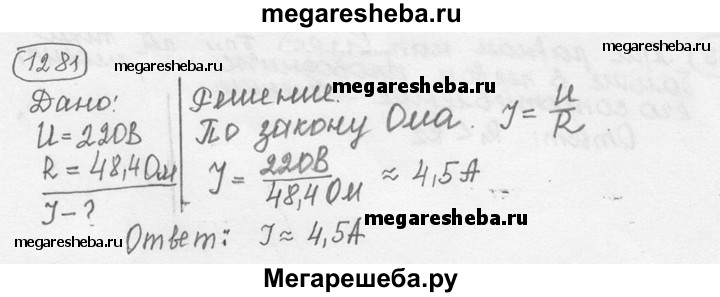 1281. Электрический утюг включен в сеть с напряжением 220 В. Какова сила тока в нагревательном элементе утюга, если сопротивление его равно 48,4 Ом?