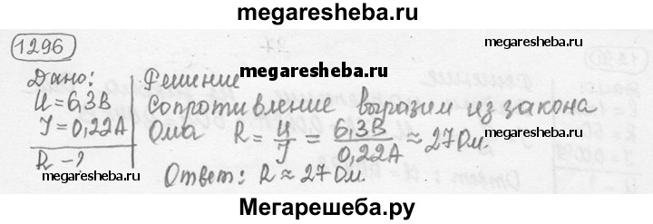 1296. Чему равно сопротивление спирали электрической лампы в рабочем состоянии, у которой на цоколе написано 6,3 В, 0,22 А?