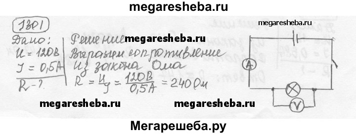 1301. Показание вольтметра, присоединенного к горящей электрической лампе накаливания, равно 120 В, а амперметра, измеряющего силу тока в лампе, 0,5 А. Чему равно сопротивление лампы? Начертите схему включения лампы, вольтметра и амперметра.