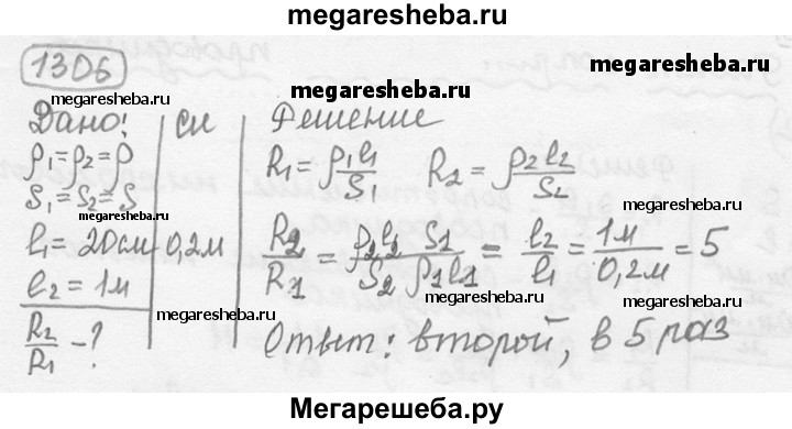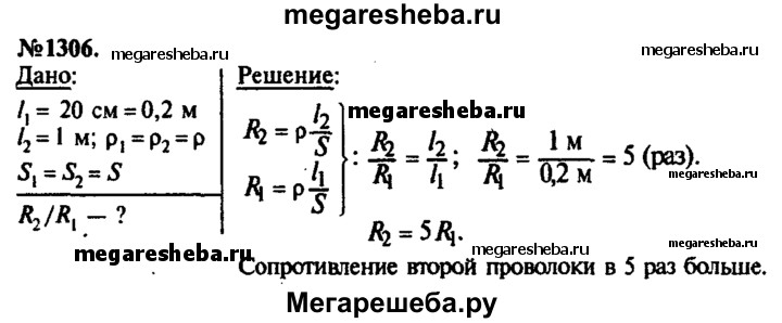 1306. Имеются две проволоки из одного и того же материала с одинаковой площадью поперечного сечения. Длина первой равна 20 см, второй 1 м. Сопротивление какой проволоки больше; во сколько раз?