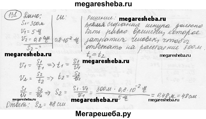 131. В подрывной технике употребляют сгорающий с небольшой скоростью бикфордов шнур. Какой длины надо взять шнур, чтобы успеть отбежать на расстояние 300 м, после того как его зажгут? Скорость бега равна 5 м/с, а пламя по шнуру распространяется со скоростью 0,8 см/с.