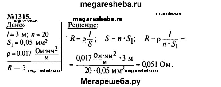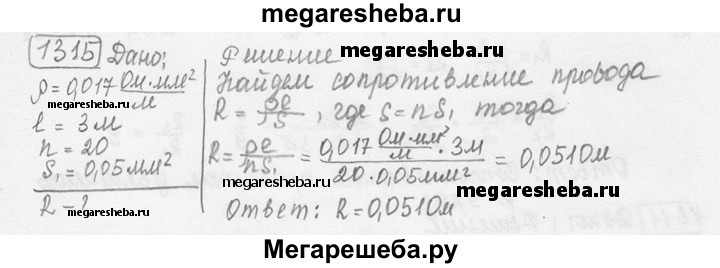 1315. Шнур, употребляемый для подводки тока к телефону, для гибкости делают из многих тонких медных проволок. Рассчитайте сопротивление такого провода длиной 3 м, состоящего из 20 проволок площадью поперечного сечения 0,05 мм2 каждая.