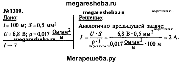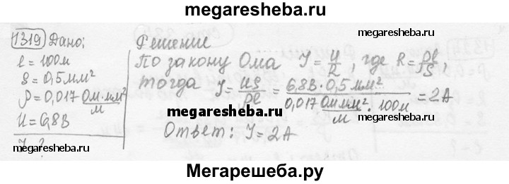 1319. Рассчитайте силу тока, проходящего по медному проводу длиной 100 м и площадью поперечного сечения 0,5 мм2 при напряжении 6,8 В.