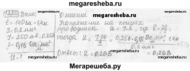 1320. Определите напряжение на концах стального проводника длиной 140 см и площадью поперечного сечения 0,2 мм2, в котором сила тока 250 мА.