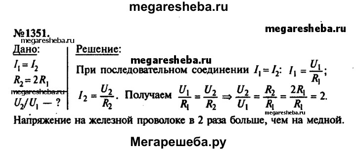 1351. К полюсам источника тока присоединены последовательно две проволоки — медная и железная. Сопротивление железной проволоки в 2 раза больше сопротивления медной. На концах какой проволоки вольтметр покажет большее напряжение; во сколько раз?