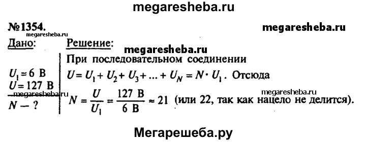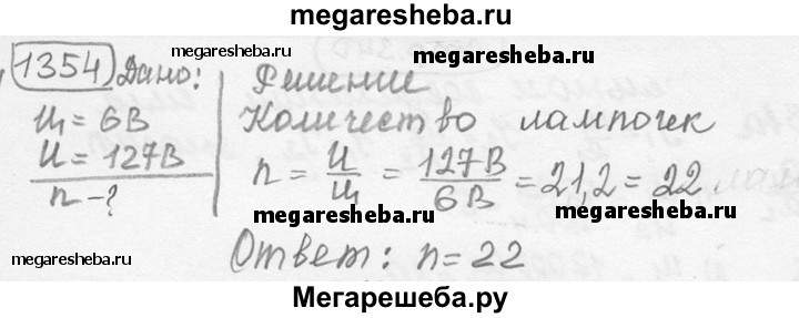1354. Сколько ламп с одинаковым сопротивлением надо соединить последовательно для изготовления елочной гирлянды, если каждая лампа рассчитана на напряжение 6 В и все они будут включены в сеть с напряжением 127 В?