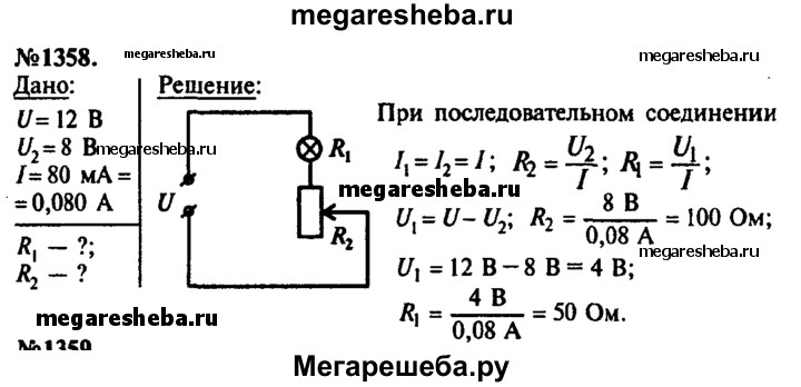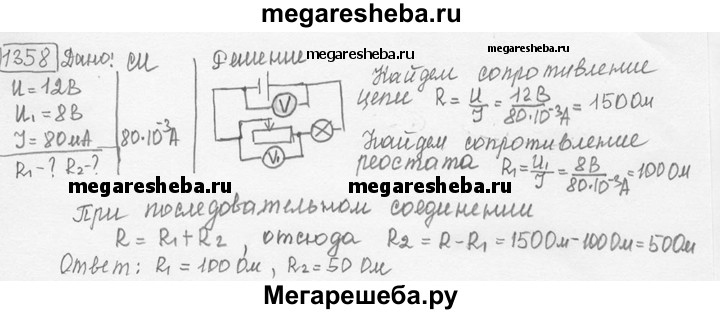 1358. Последовательно с электрической лампой включен реостат. Начертите схему цепи и определите сопротивление реостата и лампы, если напряжение на зажимах цепи 12 В. Вольтметр, подключенный к реостату, показывает 8 В. Сила тока в цепи 80 мА.
