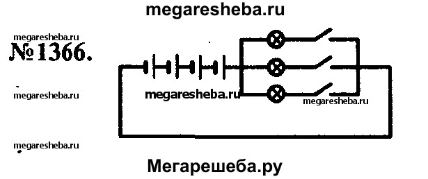 1366. Начертите схему цепи, состоящей из четырех последовательно соединенных элементов и параллельно подключенных к ним трех ламп, каждая со своим выключателем.