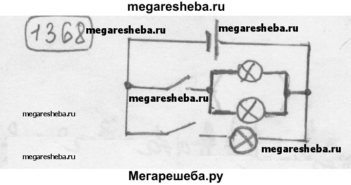 1368. В цепи батареи параллельно включены три электрические лампы. Нарисуйте схему включения двух выключателей так, чтобы один управлял двумя лампами одновременно, а другой — одной третьей лампой.