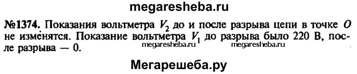 1374. При замкнутой цепи вольтметр V2 (рис. 338) показывает 220 В. Каким станет показание этого вольтметра, если в точке О произойдет разрыв цепи? Каким было показание вольтметра V1 до обрыва цепи? Каким станет показание вольтметра V1 после обрыва цепи?