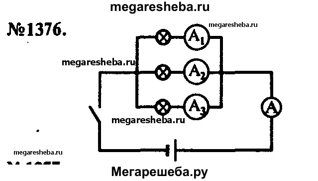 1376. Начертите схему цепи, состоящую из источника тока, трех ламп, включенных параллельно, амперметров, измеряющих силу тока в каждой лампе и во всей цепи, и выключателя, общего для всей цепи.