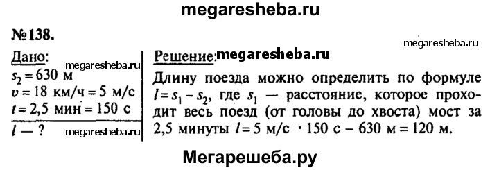 138. Определите длину поезда, движущегося равномерно по мосту длиной 630 м со скоростью 18 км/ч, если поезд проходит мост в течение 2,5 мин.