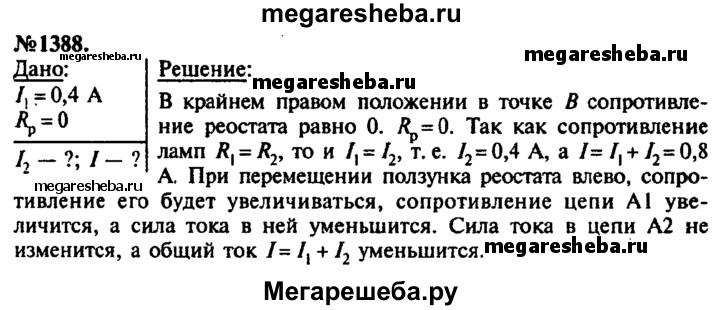 1388. В цепь (рис. 344) включены две одинаковые лампы. При положении ползунка реостата в точке В амперметр А1 показывает силу тока 0,4 А. Что показывают амперметры А и А2? Изменятся ли показания амперметров при передвижении ползунка к точке А?