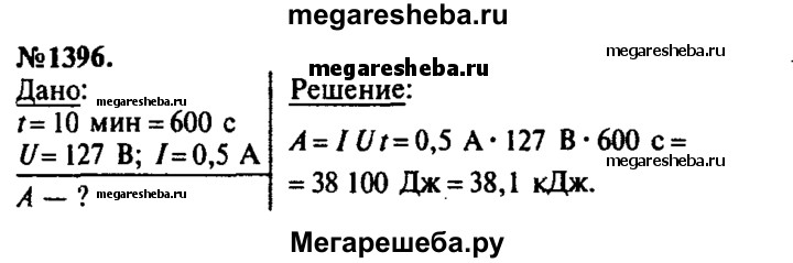 1396. Рассчитайте расход энергии электрической лампой, включенной на 10 мин в сеть напряжением 127 В, если сила тока в лампе 0,5 А.