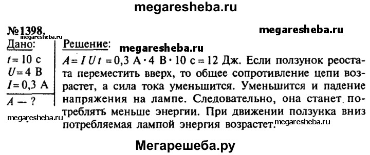 1398. По данным рисунка 346 определите энергию, потребляемую лампой в течение 10 с. Как будет изменяться потребляемая лампой энергия, если ползунок реостата переместить вверх; вниз?