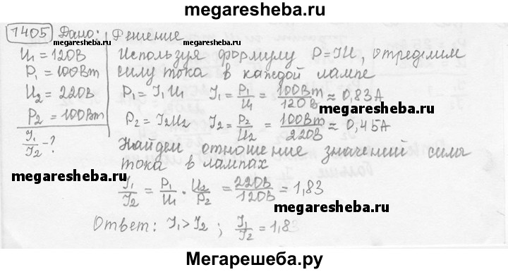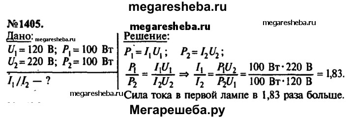 1405. На баллоне первой лампы написано 120 В; 100 Вт, а на баллоне второй — 220 В; 100 Вт. Лампы включены в сеть с напряжением, на которое они рассчитаны. У какой лампы сила тока больше; во сколько раз?