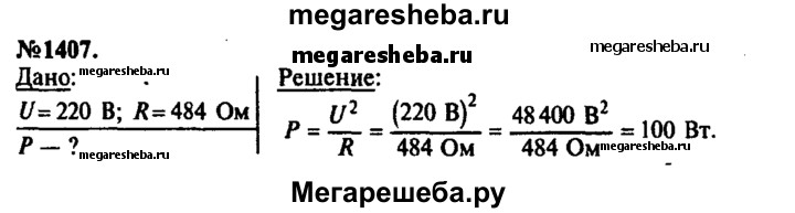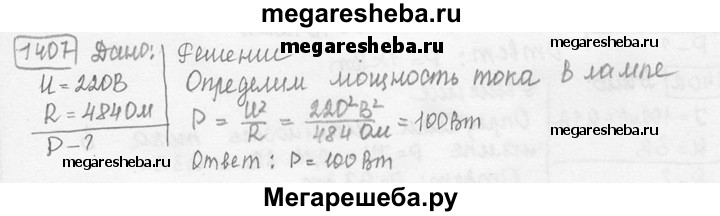 1407. Определите мощность тока в электрической лампе, включенной в сеть напряжением 220 В, если известно, что сопротивление нити накала лампы 484 Ом.