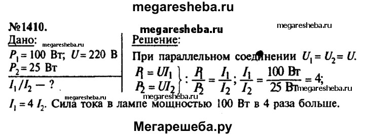 1410. Две электрические лампы мощностью 100 и 25 Вт включены параллельно в сеть напряжением 220 В, на которое они рассчитаны. В спирали какой лампы сила тока больше; во сколько раз?