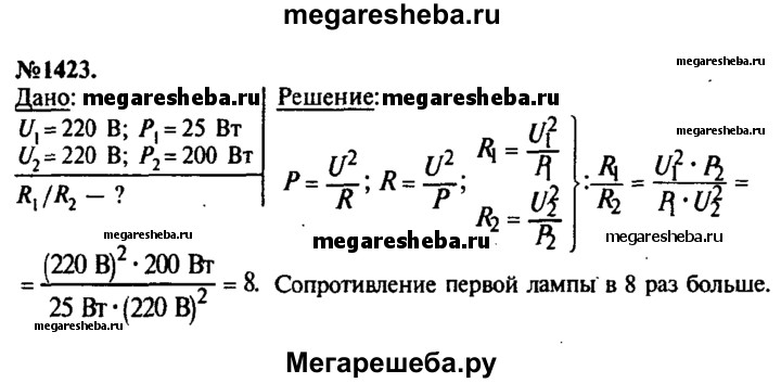 1423. На баллоне одной электрической лампы написано 220 В; 25 Вт, а на баллоне другой — 220 В; 200 Вт. Определите, сопротивление какой лампы больше и во сколько раз?