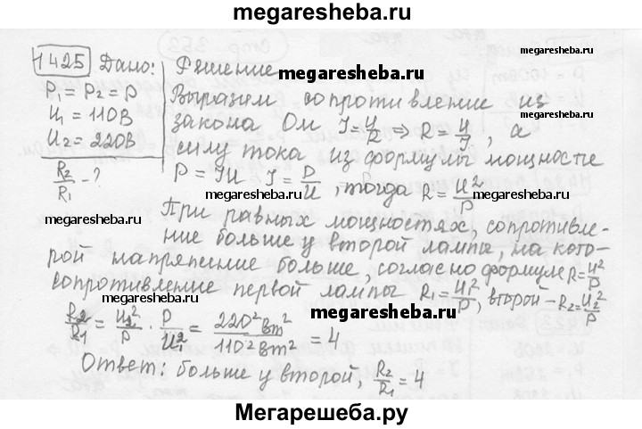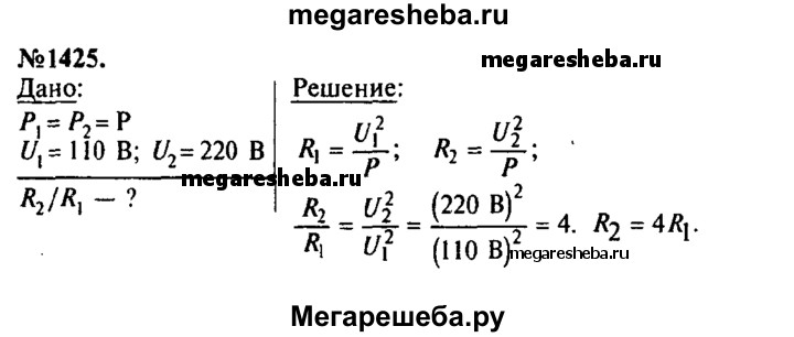 1425. Две электрические лампы имеют одинаковые мощности. Одна из них рассчитана на напряжение 110 В, а другая — на напряжение 220 В. Какая из ламп имеет большее сопротивление; во сколько раз?