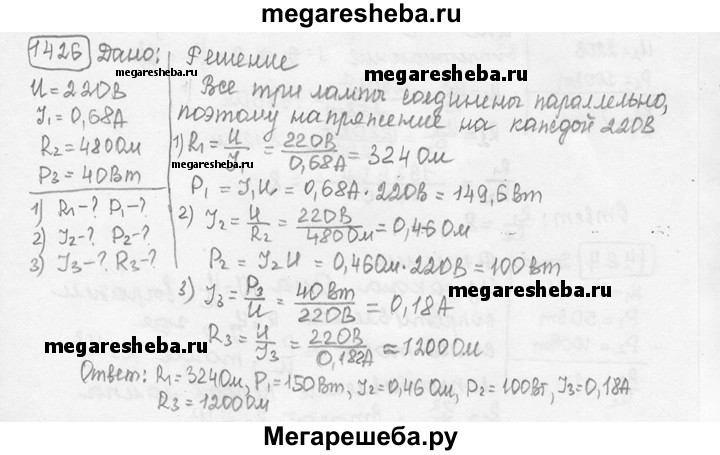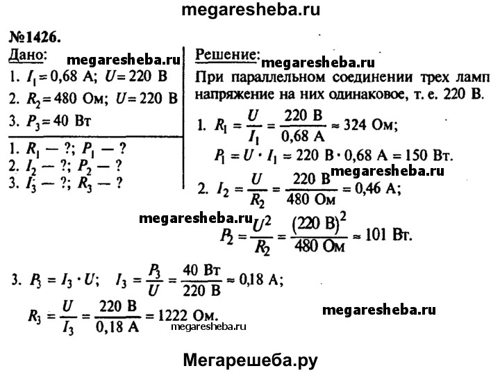 1426. Вычислите значения электрических величин (рис. 351): 1. /, = 0,68 A, R1 — ? Р1 — ? 2. Д2=480 Ом, /2 — ? Р2 — ? 3. Р3= 40 Вт, /3 — ? R3 — ?