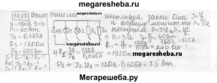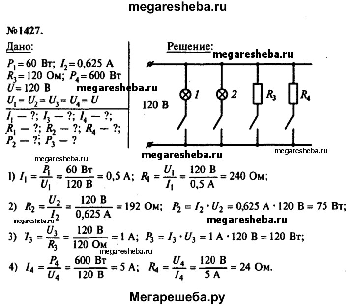 1427. На рисунке 352 изображена схема включения в сеть электрического тока напряжением 120 В двух электрических лампах 1 и 2, паяльника (R3) и электрической плитки (R4). Начертите схему, а затем вычислите значения силы тока, сопротивления и энергии, потребляемой каждую секунду этими приборами, если мощность лампы 1 равна 60 Вт, сила тока в лампе 2 равна 0,625 А, сопротивление паяльника Д3=120 0м, а мощность электрической плитки Р4 = 600 Вт.