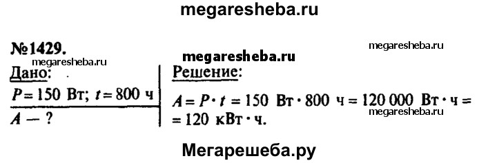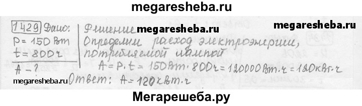 1429. Определите расход энергии электрической лампой мощностью 150 Вт за 800 ч (средняя продолжительность службы ламп).