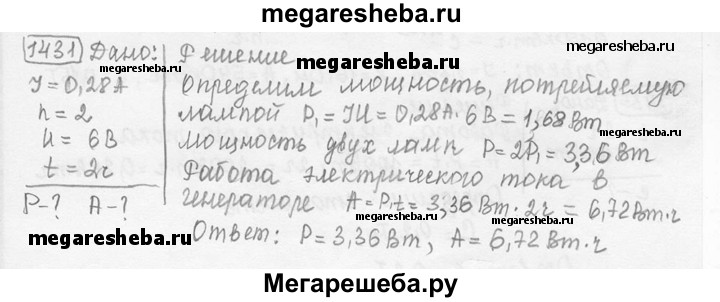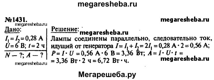 1431. Источник электрического тока, установленный на велосипеде, вырабатывает ток для двух ламп. Сила тока в каждой лампе 0,28 А при напряжении 6 В. Определите мощность генератора и работу тока за 2 ч.