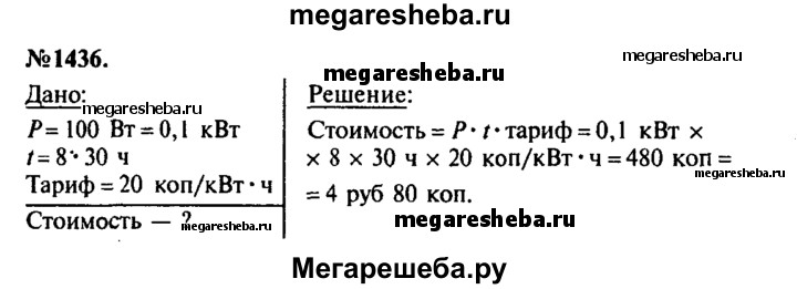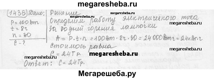 1436. Рассчитайте стоимость израсходованной энергии при тарифе Г р. за 1 кВт • ч при горении электрической лампы мощностью 100 Вт, если лампа горит по 8 ч в сутки в течение месяца (30 дней).