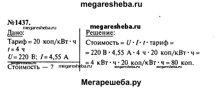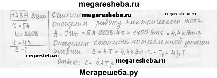1437. Рассчитайте стоимость электроэнергии при тарифе Г р. за 1 кВт • ч, потребляемой электрическим утюгом за 4 ч работы, если он включен в сеть напряжением 220 В при силе тока 5 А.