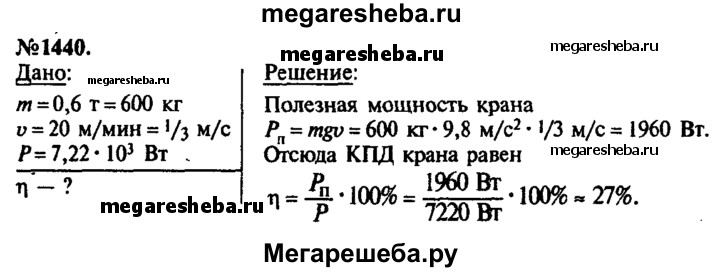 1440. Башенный кран равномерно поднимает груз массой 0,6 т со скоростью 20 м/мин. Мощность, развиваемая двигателем, равна 7,22 кВт. Определите КПД крана.