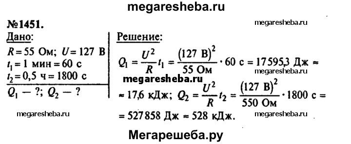 1451. Проволочная спираль, сопротивление которой в нагретом состоянии равно 55 Ом, включена в сеть напряжением 127 В. Какое количество теплоты выделяет эта спираль за 1 мин; за 0,5 ч?