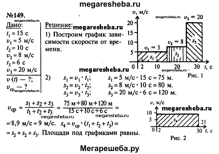 149. По данным условия задачи 145 постройте график скорости и определите отрезки пути, пройденные телом на каждом этапе движения. Постройте график средней скорости движения тела. Сравните площади под графиками.