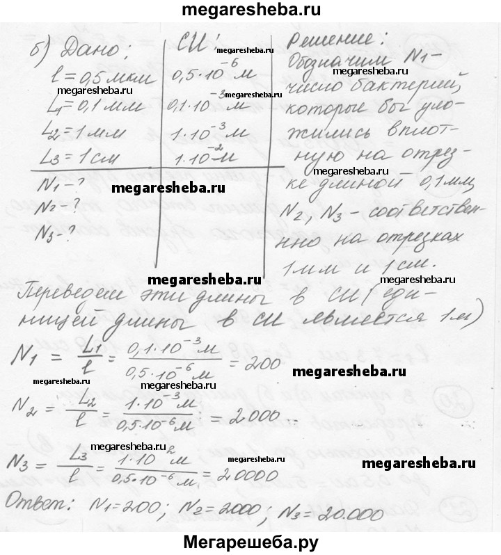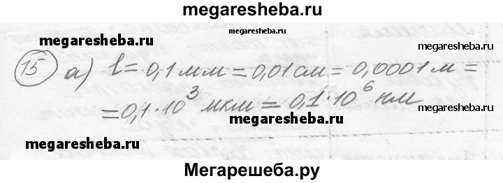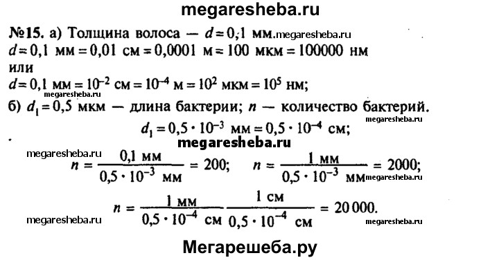 15. а) Толщина волоса равна 0,1 мм. Выразите эту толщину в см, м, мкм, нм. б) Длина одной из бактерий равна 0,5 мкм. Сколько таких бактерий уложилось бы вплотную на отрезке длиной 0,1 мм, 1 мм, 1 см?