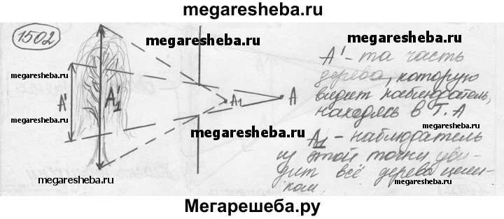 1502. Глаз наблюдателя находится перед щелью в точке А (рис. 370). Сделав схематический рисунок, покажите на нем, какую часть дерева видит наблюдатель; в какой точке (А,) перед щелью наблюдатель мог бы видеть все дерево целиком.