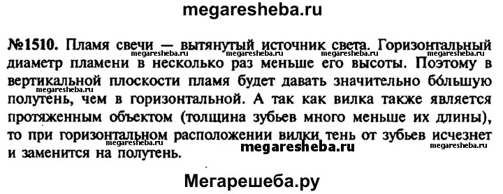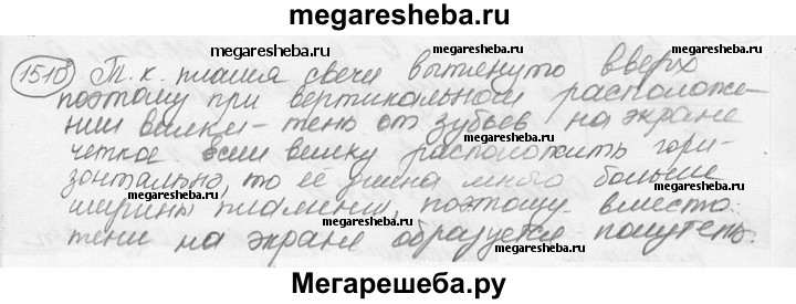 1510. Если вилку расположить вертикально параллельно пламени свечи (рис. 376), то тень от зубьев воспроизводит на экране их четкое очертание. Если вилку повернуть на 90°, т. е. расположить перпендикулярно пламени свечи, то тень на экране получается размытой и зубьев не видно. Почему?