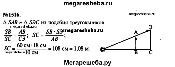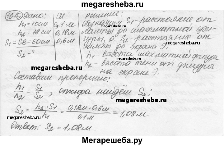 1516. Лампа S, расположенная у края стола, и шахматная фигура АВ высотой 10 см находятся на прямой, перпендикулярной к плоскости экрана Э (рис. 379). На каком расстоянии от лампы отстоит экран, если на нем высота тени от фигуры Рис- 379 равна 18 см, a SB = 60 см?