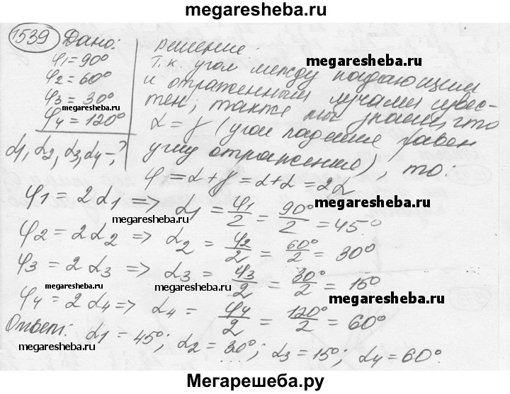 1539. При каком угле падения падающий и отраженный лучи составляют между собой прямой угол; угол 60°; угол 30°; угол 120°?