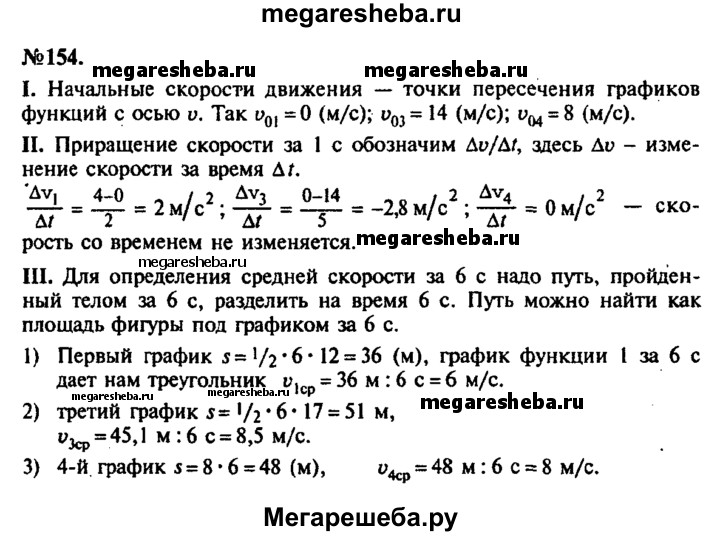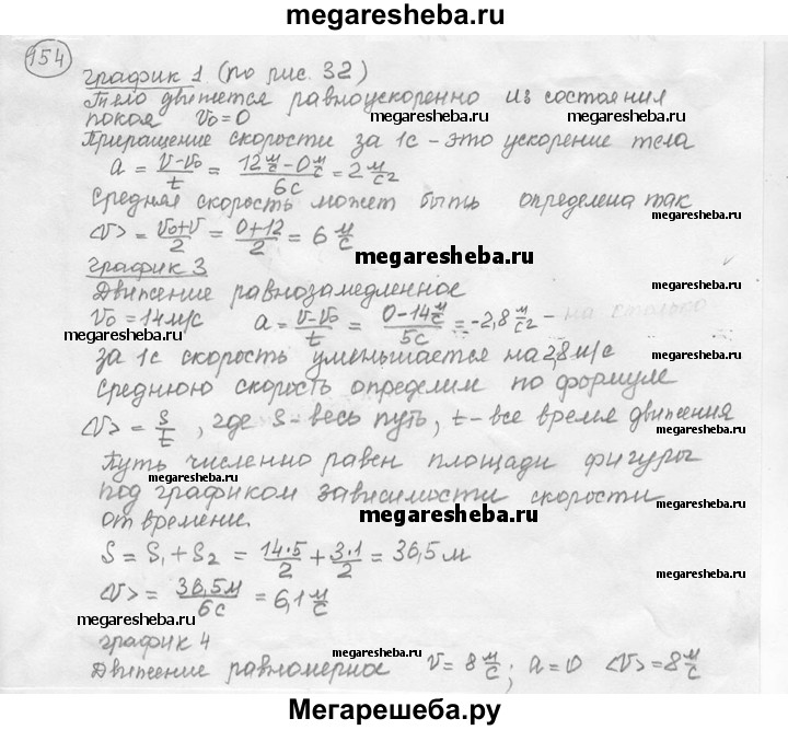 154. По данным графиков 1, 3, 4 (рис. 32) определите начальную скорость, приращение скорости за одну секунду, среднюю скорость движения за шесть секунд.