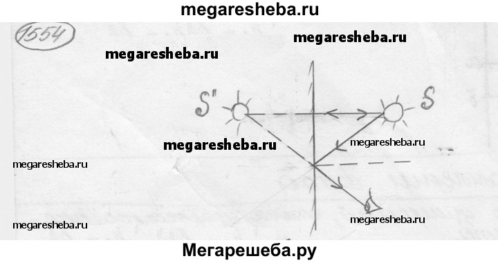 1554. В плоском зеркале MN (рис. 391) глаз видит мнимое изображение S' светящейся точки S. Построением определите положение светящейся точки и ход одного-двух лучей, образующих ее изображение в глазу.