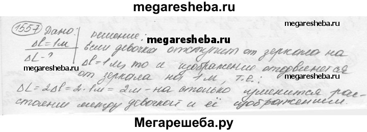 1557. Девочка стоит перед плоским зеркалом. Как изменится расстояние между ней и ее изображением в зеркале, если она отступит от зеркала на 1 м?