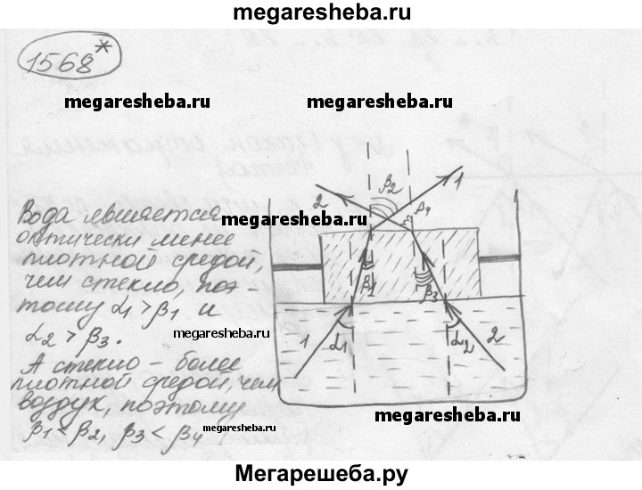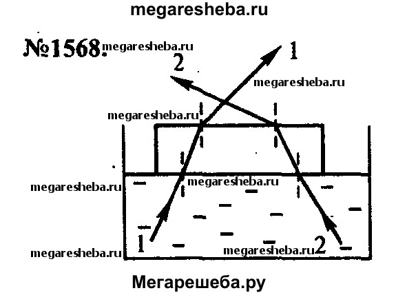 1568. Лучи 1 и 2 (рис. 400) идут из воды, находящейся в сосуде, и проходят сквозь стеклянную пластинку с параллельными гранями, укрепленную на поверхности воды. Начертите в тетради примерный ход этих лучей в стекле и в воздухе.