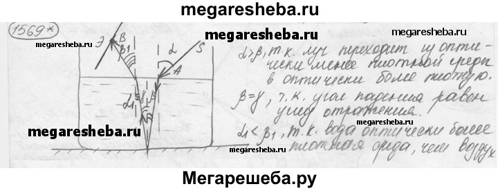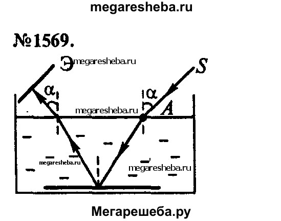 1569. На дне сосуда с водой лежит плоское зеркало (рис. 401). Начертите в тетради примерный ход светового луча SA и укажите на экране Э точку, в которую попадает луч, вышедший из воды.