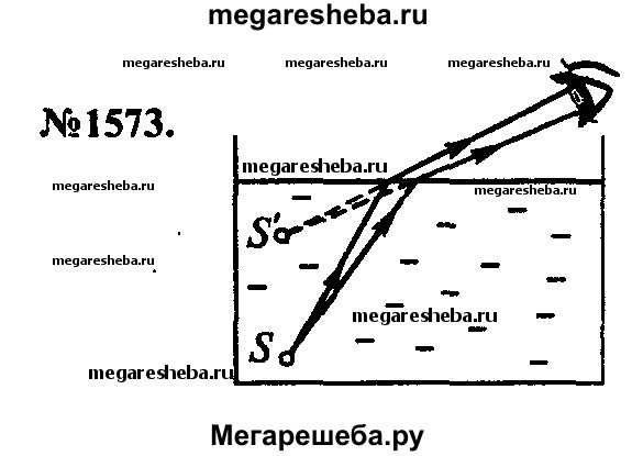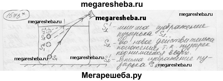 1573. Положение всплывающего пузырька воздуха S и глаза наблюдателя относительно поверхности воды в сосуде показано на рисунке 404. Выбрав два луча, начертите их примерный ход и укажите положение мнимого изображения пузырька, видимое глазом.