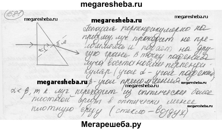 1581. Световой луч падает на стеклянную треугольную призму (рис. 407). Начертите в тетради примерный ход этого луча в призме и по выходе из нее.