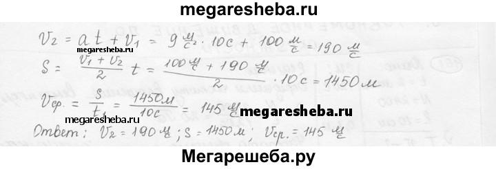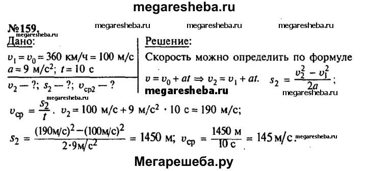159. Самолет, летевший прямолинейно с постоянной скоростью 360 км/ч, стал двигаться с постоянным ускорением 9 м/с2 в течение 10 с в том же направлении. Какой скорости достиг самолет и какое расстояние он пролетел за это время? Чему равна средняя скорость за время 10 с при ускоренном движении?