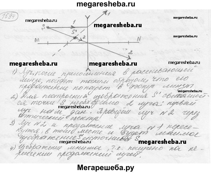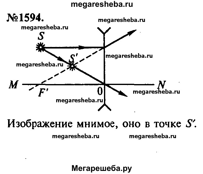 1594. На рисунке 416 показан ход светового луча, падающего на рассеивающую линзу. Выполнив необходимое построение, найдите положение главного фокуса линзы и положение изображения (S') светящейся точки S. Какое это изображение: действительное или мнимое?