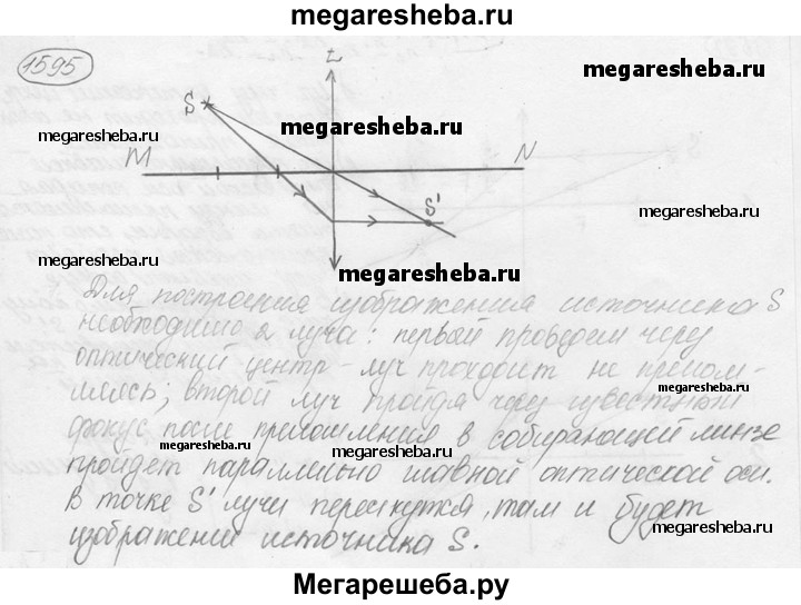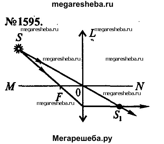 1595. Относительно оптической оси MN линзы L точечный источник света S расположен так, как показано на рисунке 417, где F — фокусное расстояние линзы. Постройте изображение этого источника; определите его положение относительно линзы.