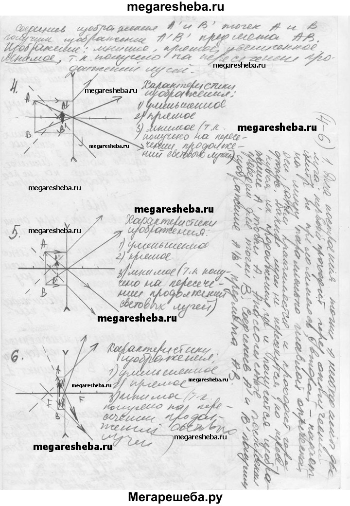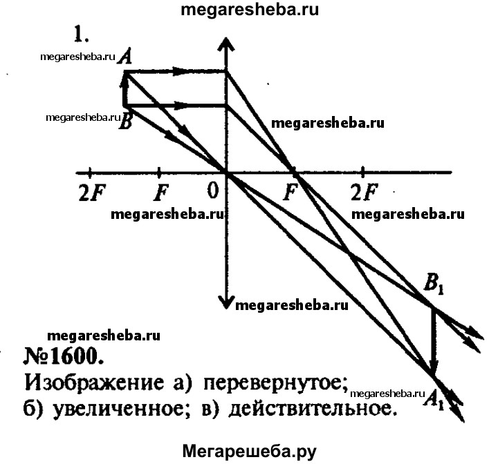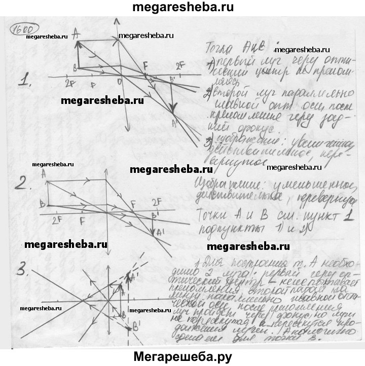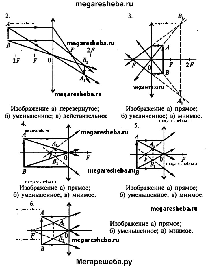 1600. Постройте изображение предмета АВ, даваемое линзами с фокусным расстоянием F, для случаев 1—6 (рис. 422). Охарактеризуйте каждое изображение.
